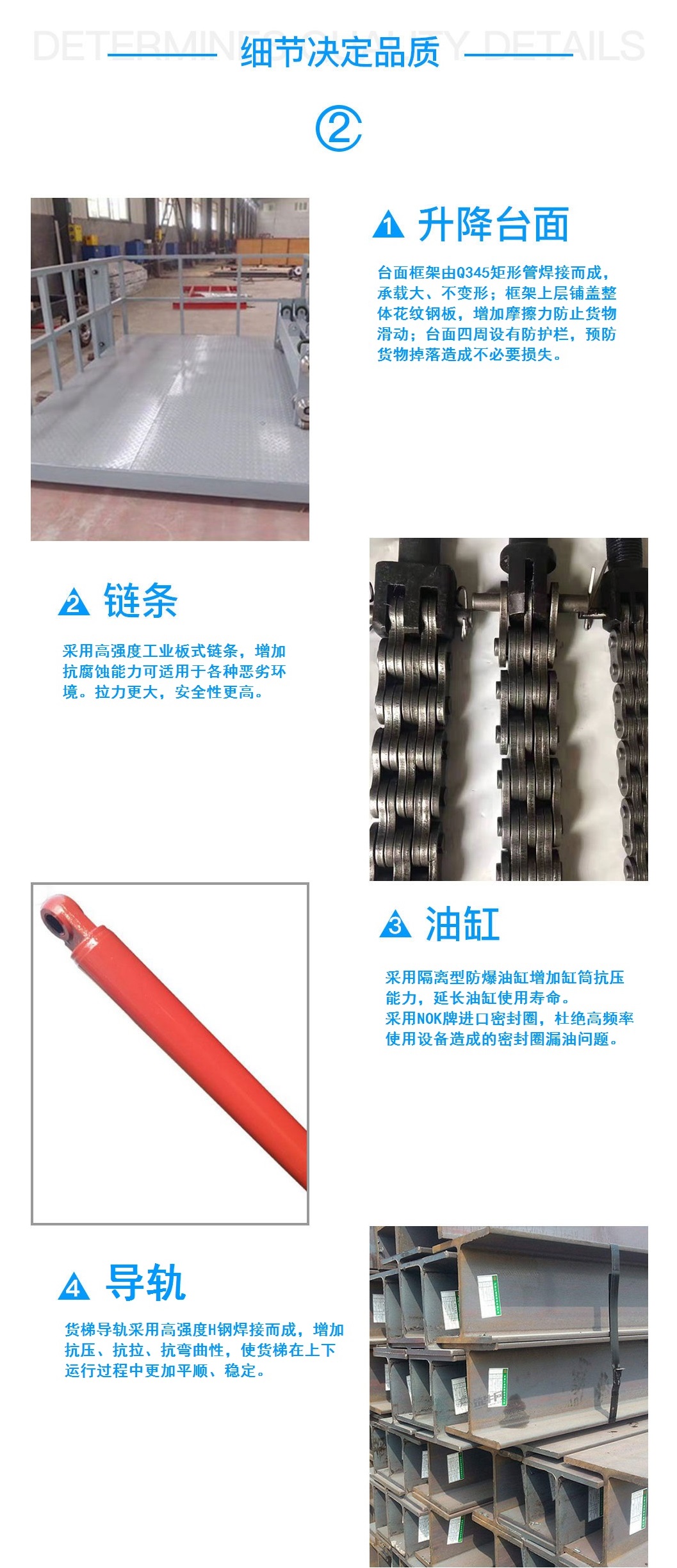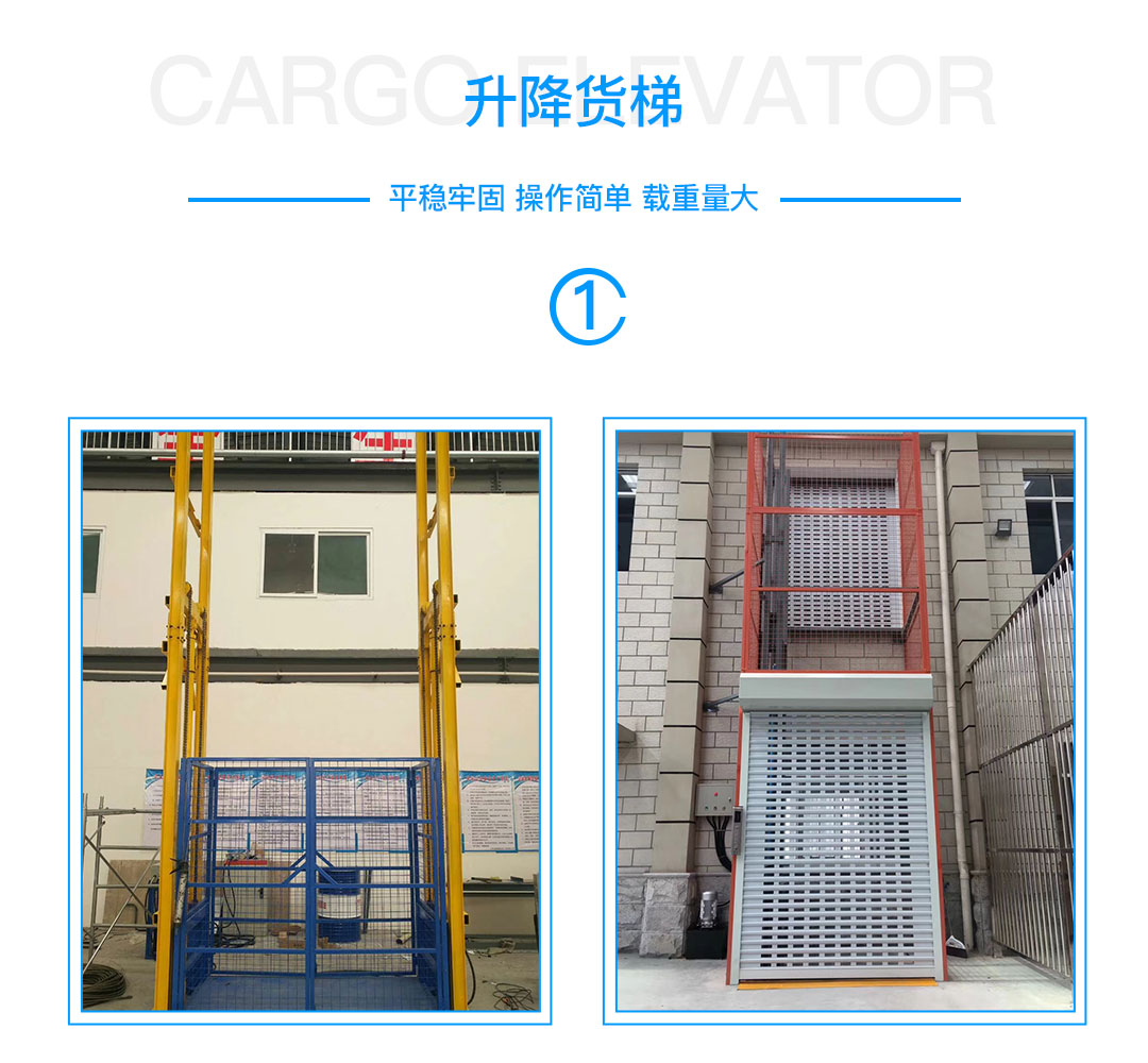 液壓升降貨梯,主要用于樓層間高空貨物運(yùn)輸。載重1-150噸,升高高度1-45米.室內(nèi)、室內(nèi)外均可安裝。導(dǎo)軌式升降貨梯采用旁置油缸,運(yùn)行平穩(wěn)、噪音低、維修方便、使用壽命較長;停電時,可使用手動應(yīng)急下降,安全、方便、快捷、實用;地坑深度一般為0-30cm,頂層高度不受限制